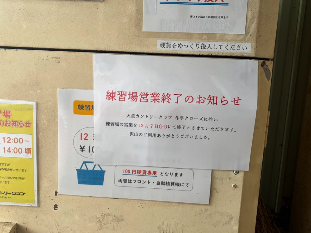 2025年 練習場営業終了のお知らせ 2025年12月7日 新着情報 ご覧いただきありがとうございます。 天童カントリークラブ 冬季クローズに伴い、練習場の営業を12月7日(日)にて終了とさせていただきます。 今年も沢山のご利用ありがとうございました。
